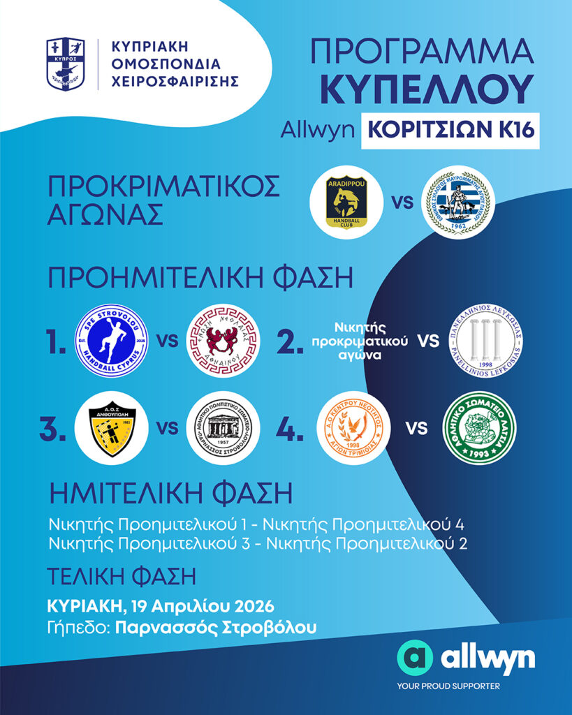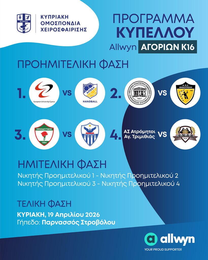 Το κύπελλο Allwyn Αγοριών Κ16 θα αρχίσει την Τετάρτη, 15 Απριλίου, από την προημιτελική φάση, με τη διεξαγωγή των αγώνων Ευρωπαϊκό Πανεπιστήμιο-ΑΠΟΕΛ (1), Παρνασσός-ΑΟ Ανθούπολης (2), Προοδευτικός-Sabbianco Ανόρθωση (3) και ΑΣ Ατρόμητοι Αγ. Τριμιθιάς-ΕΝΑΒ (4). Στην ημιτελική φάση θα συγκρουστούν οι νικητές των ζευγαριών 1 και 2, καθώς και οι ομάδες που θα επικρατήσουν από τα ζευγάρια 3 και 4.