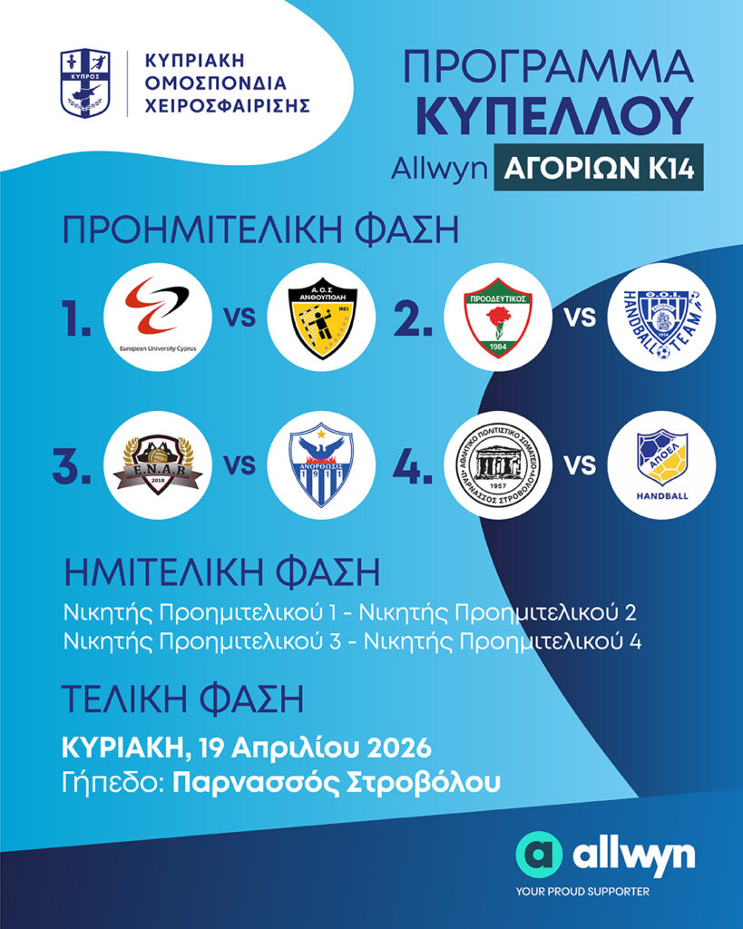 Στο κύπελλο Allwyn Αγοριών Κ14 στην προημιτελική φάση θα γίνουν οι αναμετρήσεις Ευρωπαϊκό Πανεπιστήμιο-ΑΟ Ανθούπολης (1), Προοδευτικός-ΘΟΪ Αυγόρου (2), ΕΝΑΒ-Sabbianco Ανόρθωση (3) και Παρνασσός-ΑΠΟΕΛ (4). Στα ημιτελικά θα αναμετρηθούν οι ομάδες που θα πάρουν την πρόκριση από τα πρώτα δύο παιχνίδια και το άλλο ζευγάρι θα αποτελέσουν οι ομάδες που θα περάσουν από τα άλλα δύο ματς.